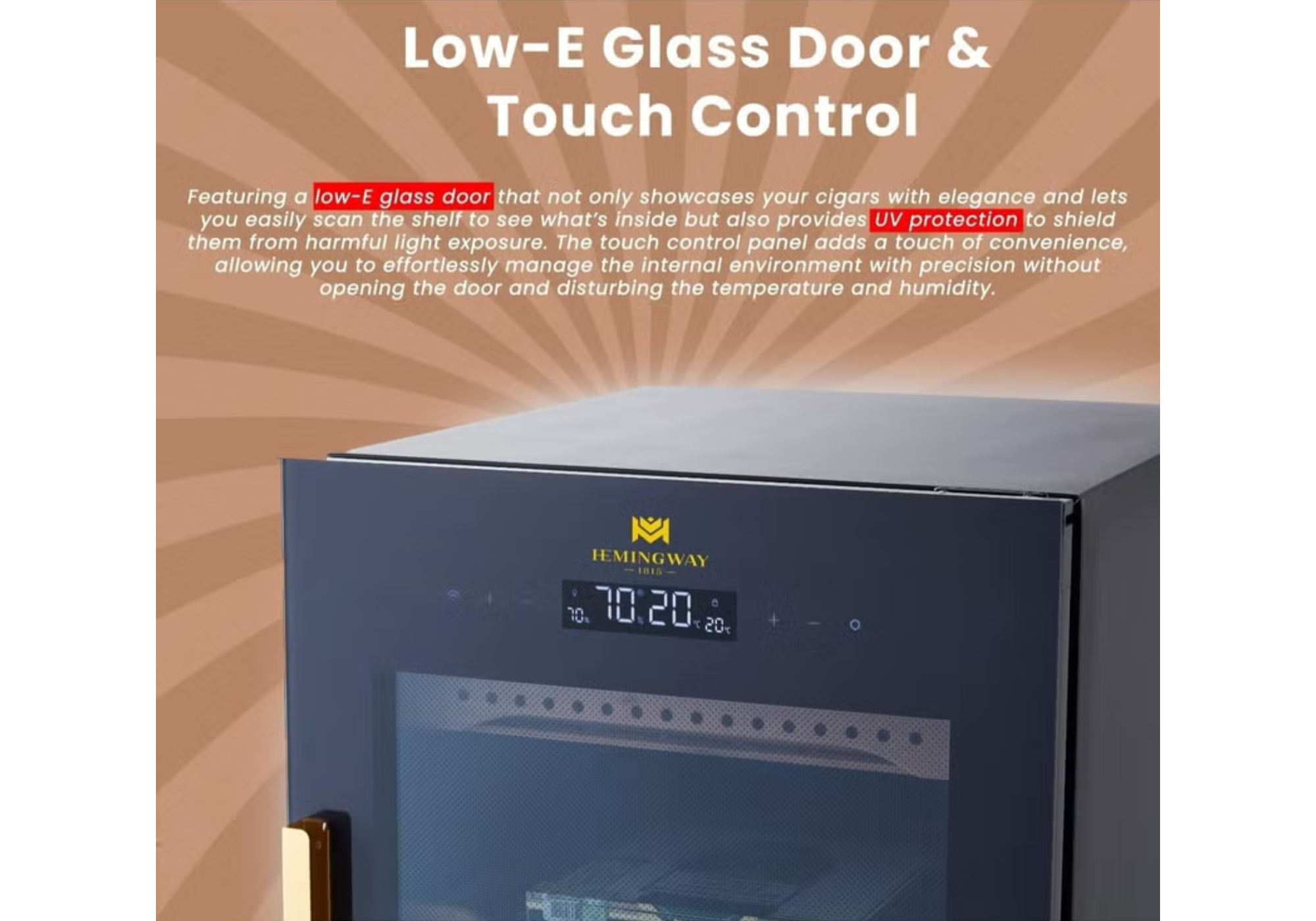 With precise humidity and temperature control, this modern unit features a sleek touch screen interface and a secure fingerprint lock. The elegant double-layer tempered glass door enhances its insulation and aesthetic appeal, while three handcrafted wooden shelves offer flexible organization.